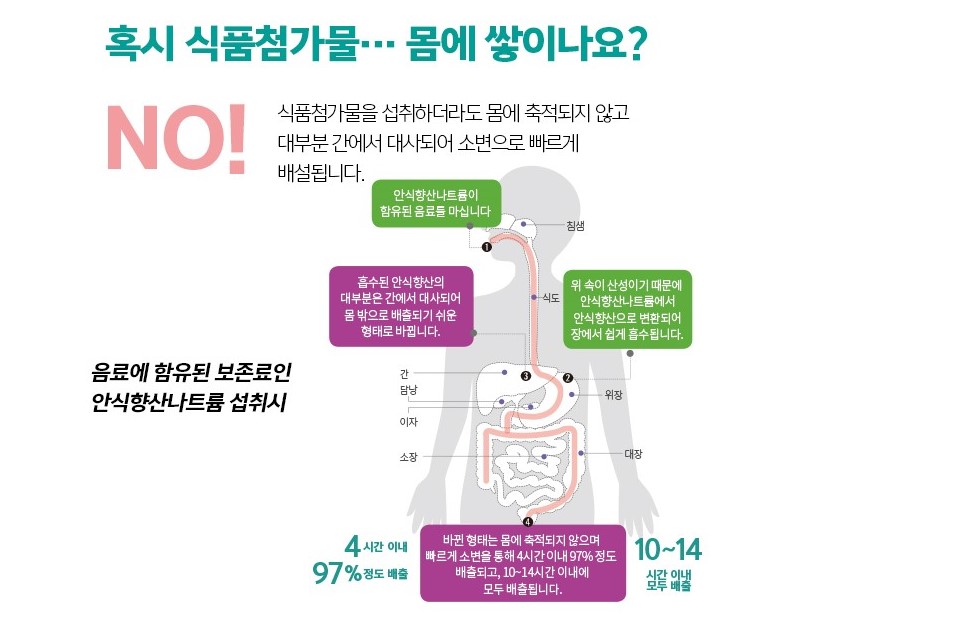 식품첨가물은 섭취하더라도 몸에 축적되지 않고 대부분 간에서 대사 되어 소변으로 빠르게 배출됩니다.