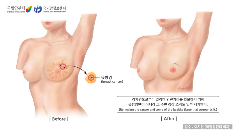 ㆍ수술 방법 : 유방전체를 제거하는 유방 전절제술, 부분만 제거하는 유방 보존적 절제술이 있음.