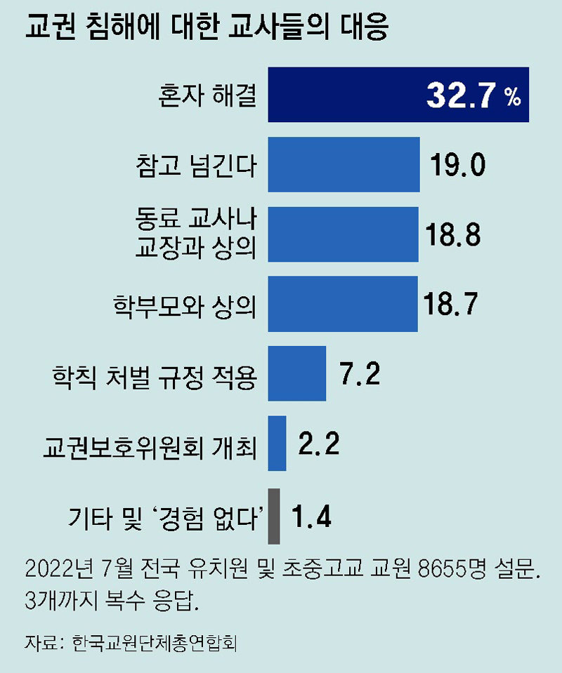 ※ 교권침해 발생 시 교사들의 대응은 대부분 혼자 해결하고 있다는 걸 알 수 있었습니다.