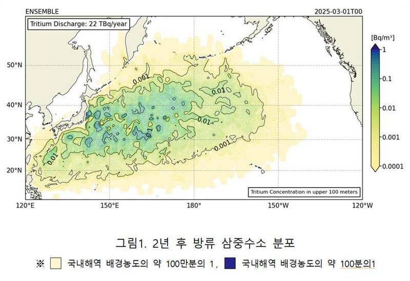 일본이 후쿠시마 오염수를 방류하면 방사성 물질인 삼중수소가 4~5년 뒤 제주해안에 유입되기 시작하다는 시뮬레이션 결과가 나왔다. 다만 방류 2년 뒤에는 해류의 영향으로 저농도의 오염수는 일시적으로 유입될 수 있다는 분석이다.