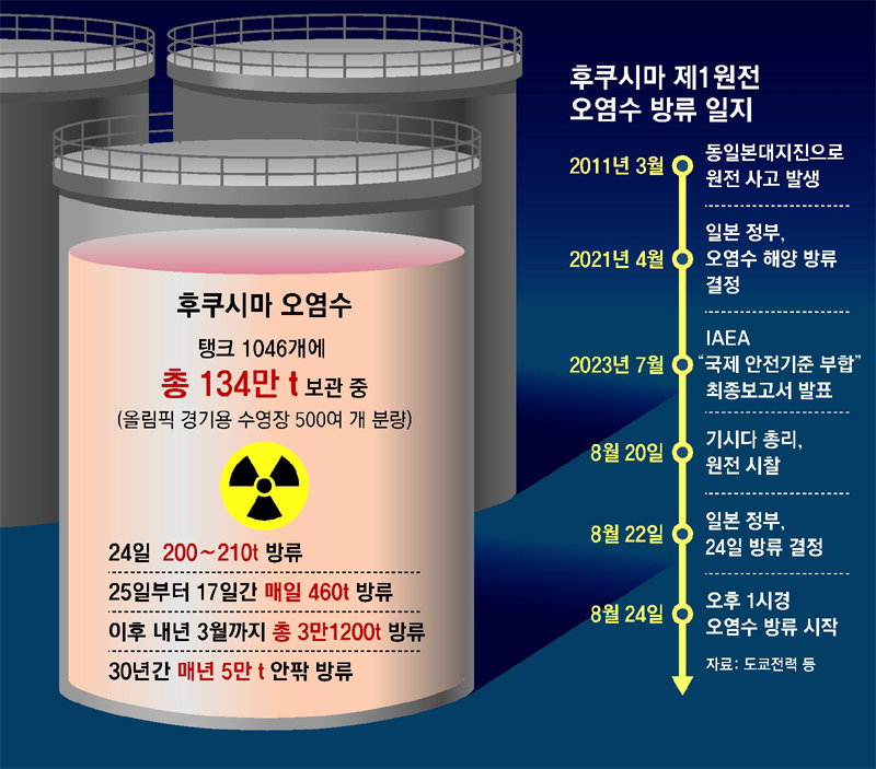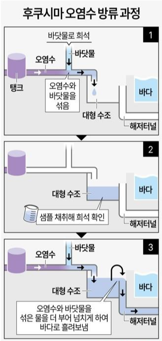 도쿄전력은 지난 22일 일본 정부가 오염수 방류 개시 일자를 24일로 확정하자 오염수 약 1t(통)을 희석 설비로 보내 바닷물 1200t과 섞어 대형 수조에 담갔습니다. 이후 희석된 오염수에서 채취한 표본을 삼중 수소 농도가 방류 기준치인 1L당 1500 베크럴 미만인지 확인하는 절차를 거쳤습니다.
