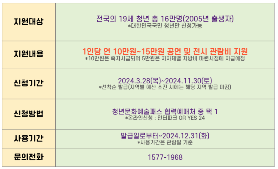대한민국 19세 청년들이 부담 없이 공연과 전시를 이용가능하게 최대 15만 원을 제공합니다.
