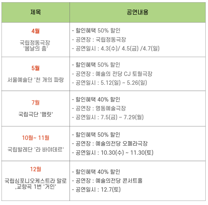 국립발레당 등 11개 국립예술단체와 공연시설의 관람권 할인 서비스제공합니다.