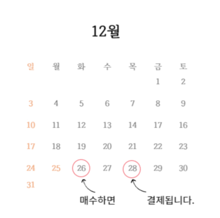 2023년 12월 달력입니다. 일반적으로 마지막 영업일(12월29일) 은 거래소휴장입니다. 2023년 마지막 거래일은 28일이 되며 28일까지 주식을 보유 하기 위해서는 26일까지는 매수체결을 완료해야 합니다. 국내주식이 3일 결제이기 때문에 26일에 매수체결을 완료해야 28일에 결제되어 결산일 보유를 인정 받게 됩니다. |