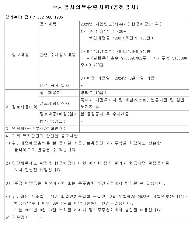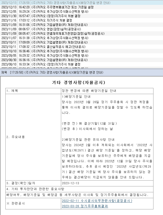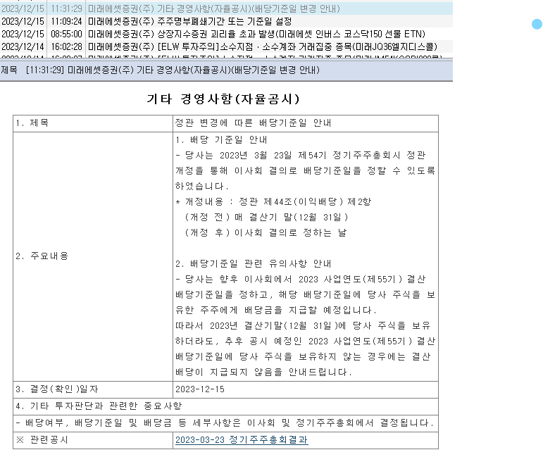마찬가지로 정관이 변경되었고 배당기준일이 이사회에서 정하는 날로 변경된 것을 알 수 있습니다.